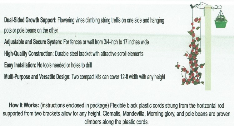 FenDuo (TM) Fence-Top Trellis Kit In front of a stone wall Hang pots on inside of fence The Kit inside packaging Mounted on a Block Wall Share this: Share on X (Opens in new window) X Share on Facebook (Opens in new window) Facebook Like Loading...